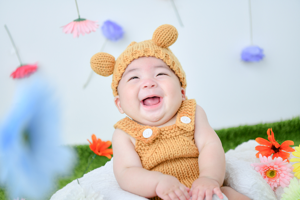 クマさんのおむつカバーをつけ、クマさんに囲まれています