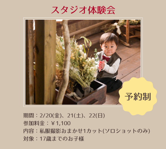 OPEN10周年を記念して 2026.01.09より浦和店がリニューアルオープン♪ 新しい背景をより多くの方に体験頂くため、 スタジオ体験会を開催します! 七五三やベビー撮影などお考えの方は 是非一度スタジオの見学にいらしてください