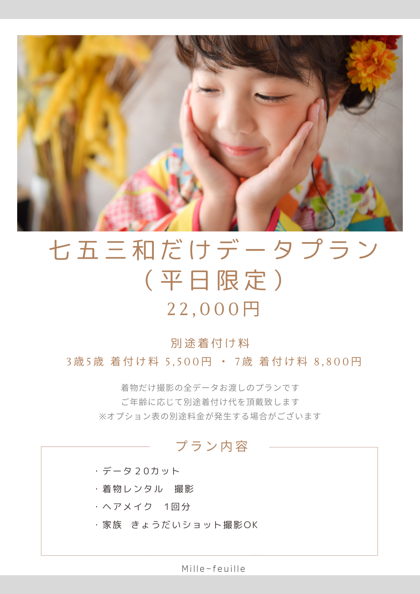 ![]() ★七五三和だけデータプラン 22,000円~ ※平日限定 別途着付け料金 3.5歳着付け料 5,500円・7歳着付け料8,800円 【プラン内容】